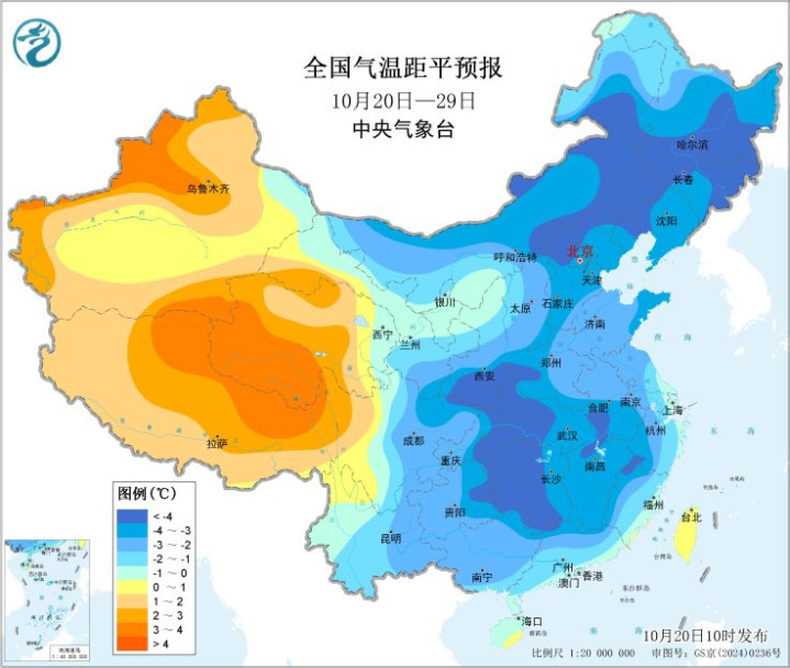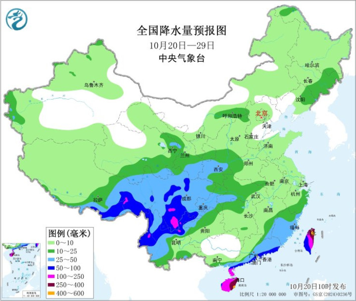未来10天(10月20-29日),西北地区东南部、河南西部、江汉南部、湖南西北部、西南地区、西藏东部及华南沿海、台湾岛等地累计降水量有30~60毫米,其中四川中部和南部、云南西部和北部、贵州西部、广东沿海地区、海南岛、台湾岛及西藏东南部等地的部分地区80~150毫米,海南岛东部、台湾岛北部部分地区有200~300毫米,局地超过400毫米;上述大部地区降水量较常年同期偏多5~8成,部分地区偏多1倍以上。