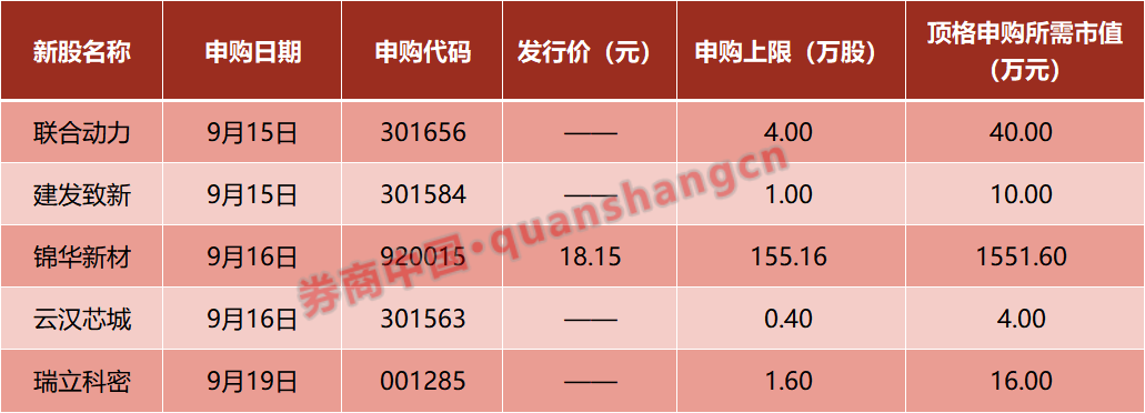 本周(9月15日—9月19日)有5只新股发行。周一:联合动力、建发致新;周二:锦华新材、云汉芯城;周五:瑞立科密。