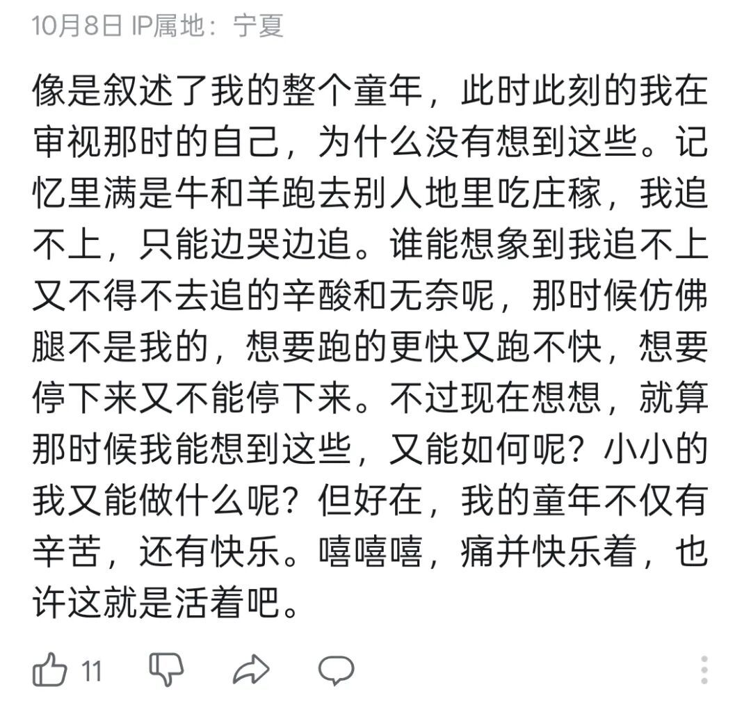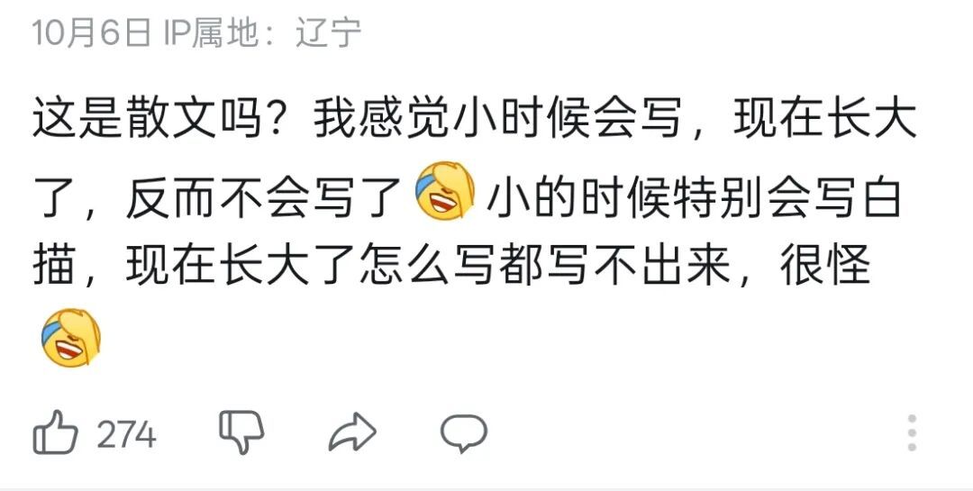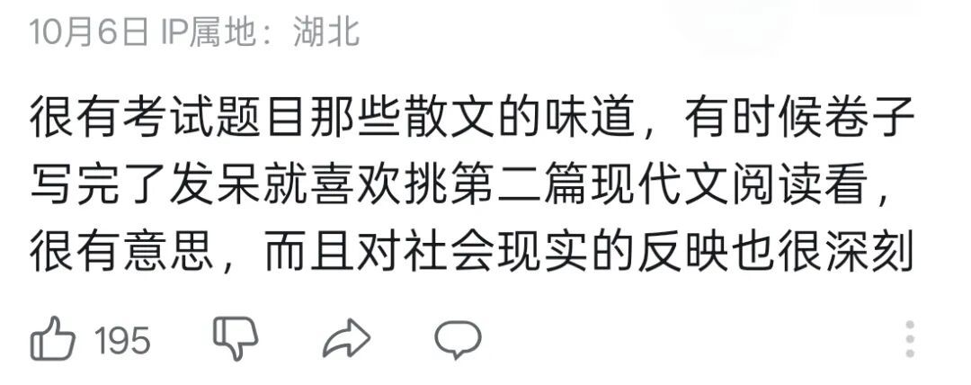 有网友在她的文字里,看见了语文教科书的影子。大家还主动在评论区给她的文章出阅读理解题,一句“表达了作者的思乡之情”,带着成长的幽默之余,也让人仿佛回到学生时代读文章的那份质朴。
