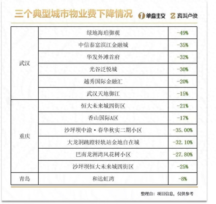 不仅降,降的还不少,个别楼盘的物业服务费降幅高达49%,几乎腰斩。其中武汉绿地海珀御观物业费就从7.6元/平方米·月调整为3.84元/平方米·月,降幅极大。
