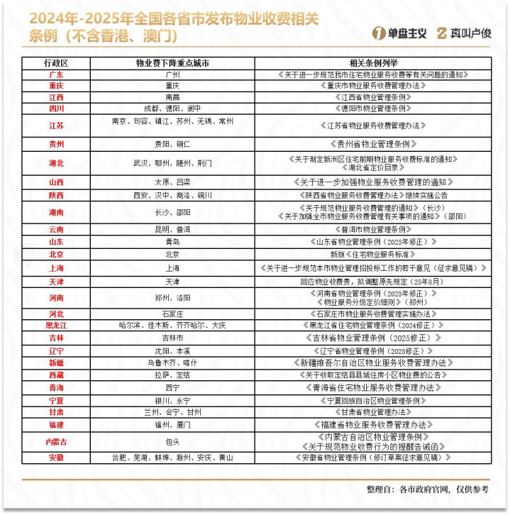 于是,我统计了2024年至2025年所有省份重点城市出台的相关规定,发现几乎所有省、直辖市、自治区都在逐步完善规范物业收费标准。
