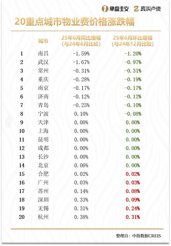 以全国重点的20城市举例,我们来看25年六月的数据。2025年6月,二十城物业服务价格综合指数为1074.47,同比下跌0.11%,环比下跌0.08%,超过1/3的城市的物业费都在下跌的过程中。