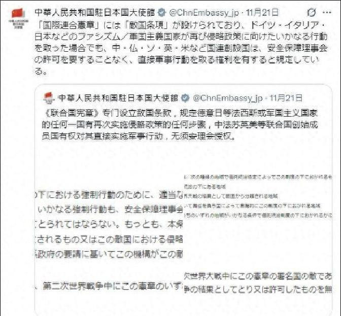 所谓“敌国条款”,现在被中方拿出来,就是想让对方回想一下过去在战争中的那些行为记录,并且警示现在的某些政策倾向。对如何表述存在争议。日本外务省拿出了1995年联合国大会一份文本,说那段历史性的条款已经过时、影响不大;但是另一种说法认为联合国大会这种决议大多属于建议性质,不等同于把宪章条文删掉。宪章文本没有被修改或撤回,相关条款的法律位置还在那里。这就意味着单方面在外交话语中拿出这一段条款使用,本身就是用历史和法理给对方施加压力,表达出一种不容轻视的严重性。把它当成是“可以用常规调解方式解决的分歧”,是对对手决心的一种低估。