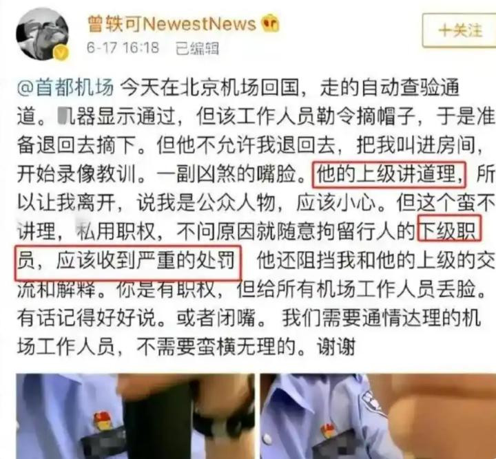 2019年6月,她在机场过安检时,被要求按规定摘帽子配合查验,这本是再普通不过的流程,她却愣是当成了人身侮辱。