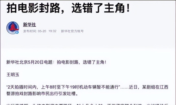 这件事很快引发热议,新华社直接发文痛批剧组“非法占用道路”,指责其漠视公共利益。