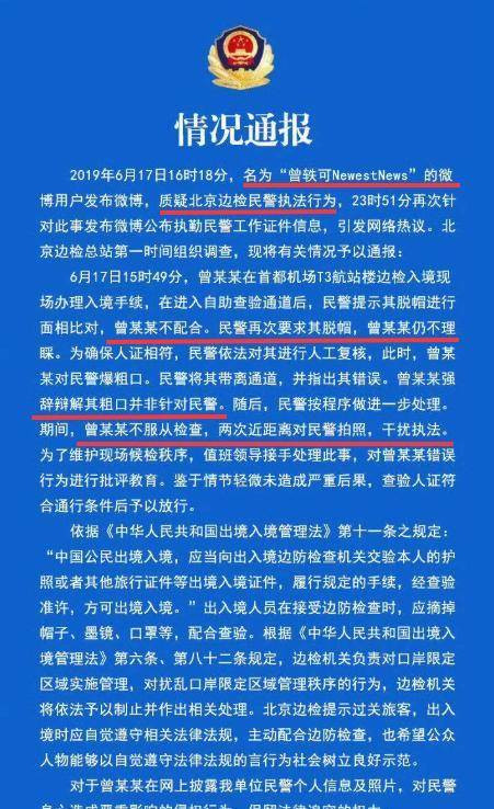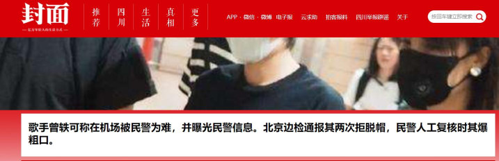 封面新闻——《歌手曾轶可称在机场被民警为难,并曝光民警信息。北京边检通报其两次拒脱帽,民警人工复核时其爆粗口》